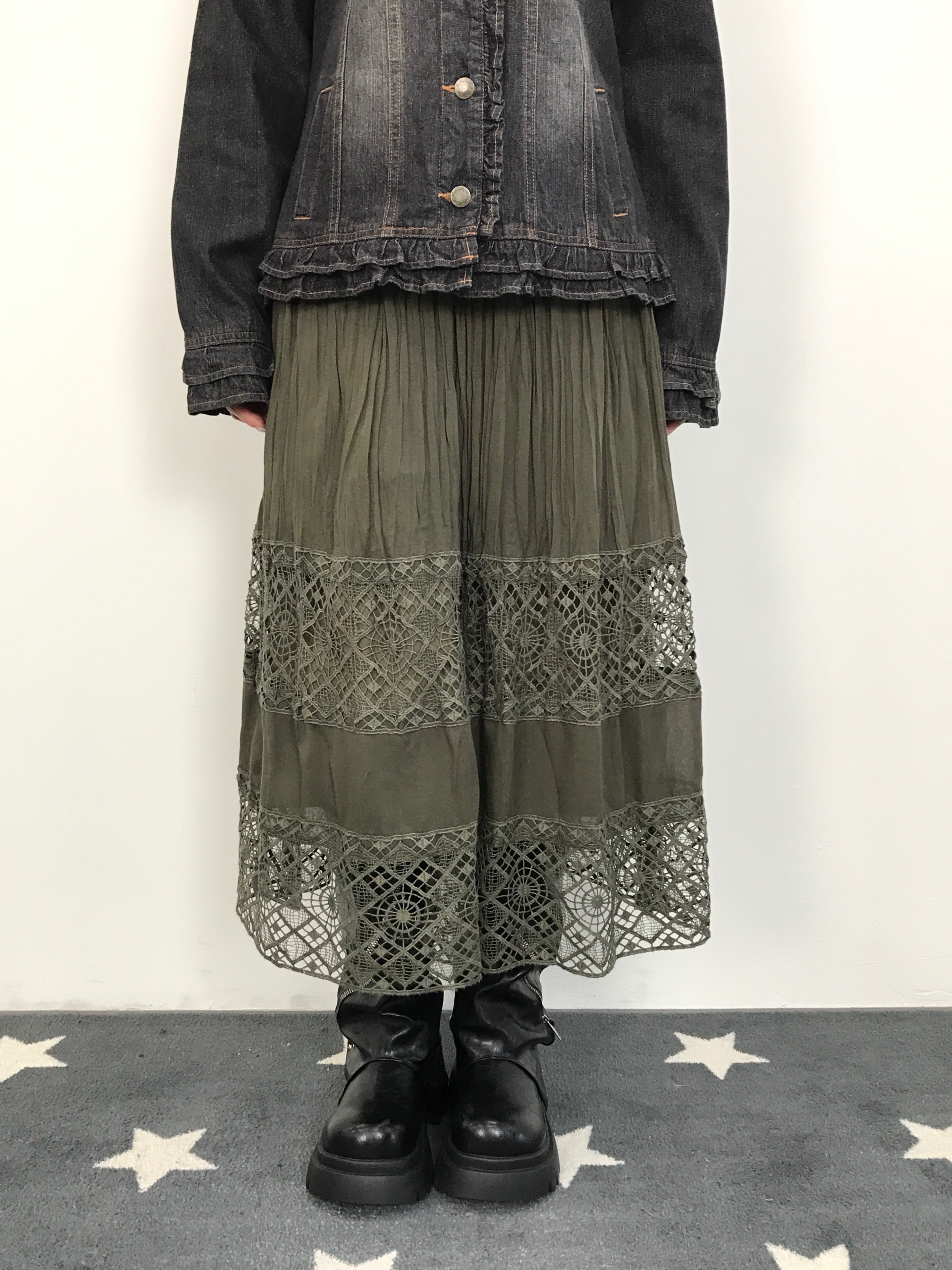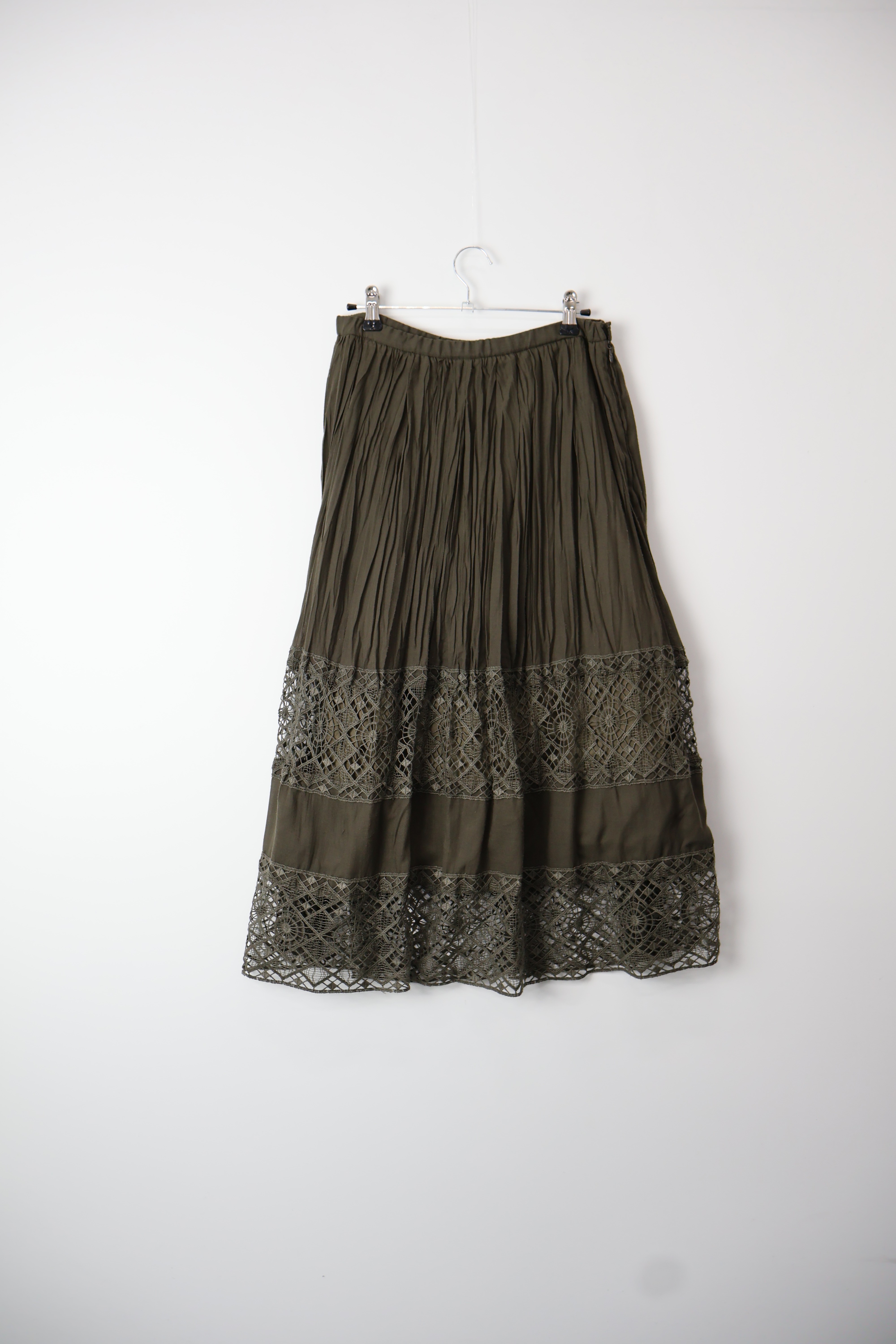 Jpn Olive Green Pleated Lace Maxi Skirt