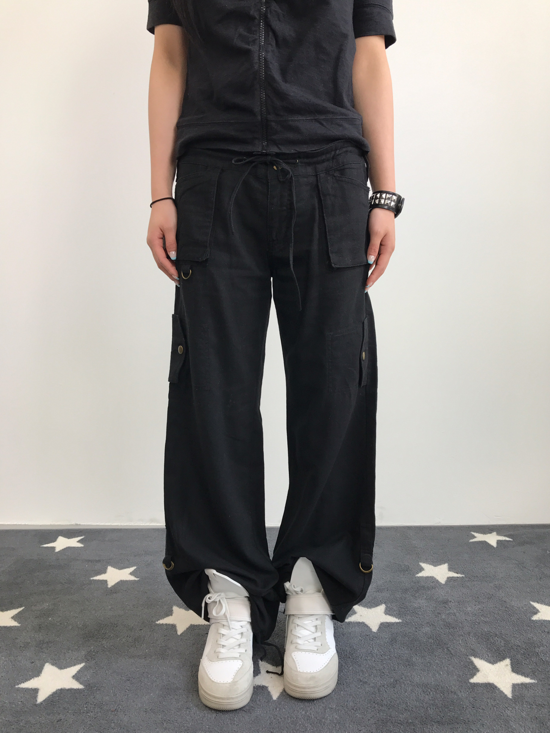 Jpn Y2K Black Linen Parachute Cargo Pants