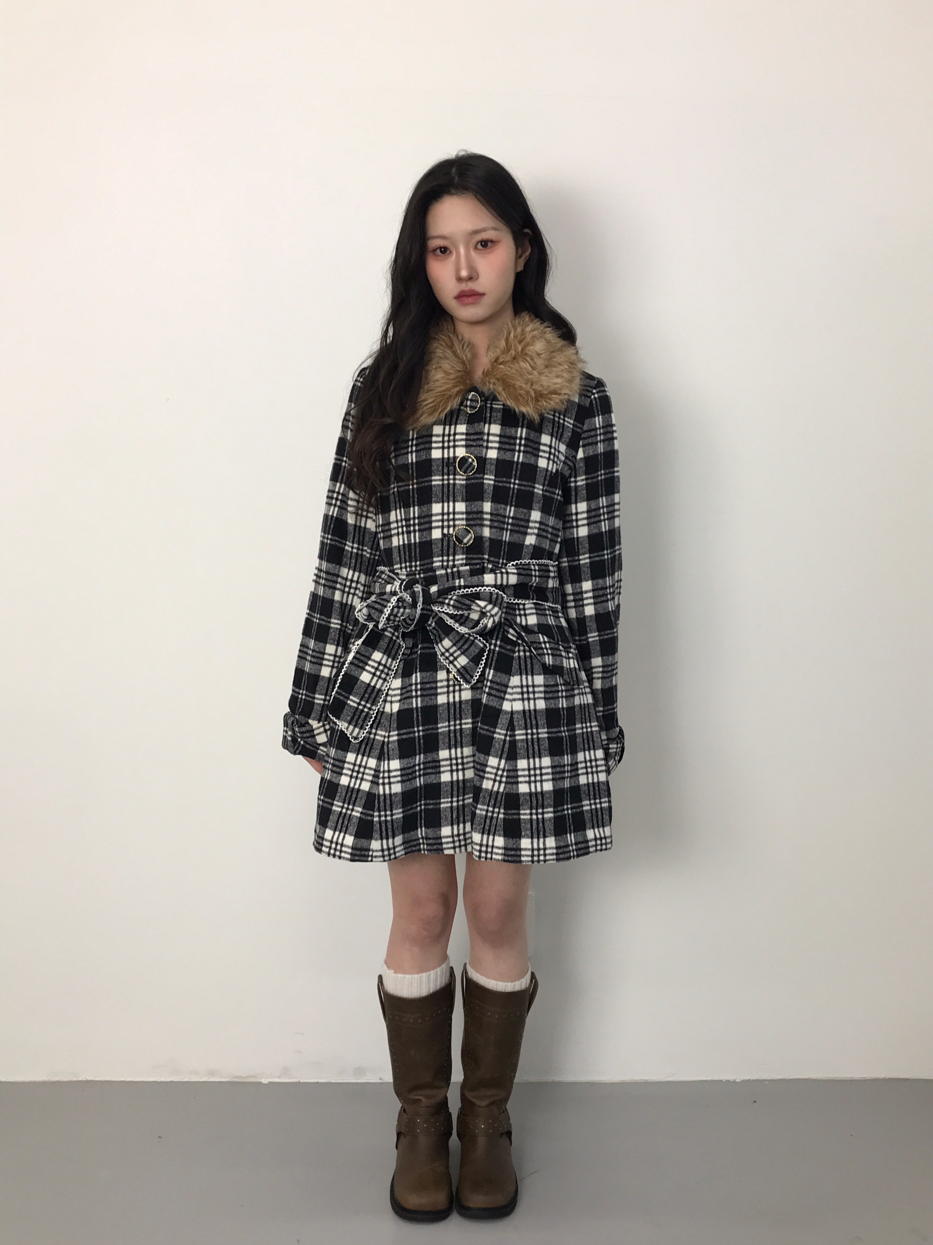 Pinky Girls Onee-Gyaru Check Fur Collar Coat