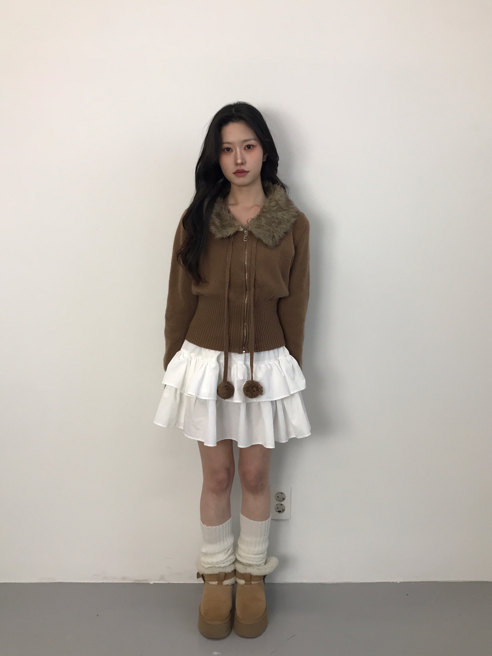 Vintage Fur Collar Pom-pom Zip-up Cardigan